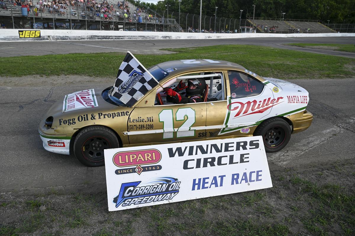 A Heat #1 1st 6-Pat Dent; 2nd 91-Gord Alblas; 3rd 19-Jacob Newman; 4th 99-Tim Lyon; 5th 5+4-Brian Barden; 6th 49-Caleb Sattler; 7th 98-Andre Newman; 8th 33-Todd Miller.
